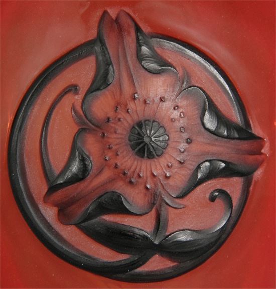Fleur de Pavot noire, gravée à la roue, sur fond rouge.