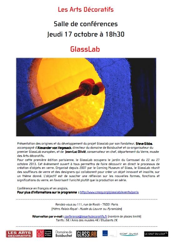 Lors de cet évènement, une conférence en Anglais et Français sera organisée en présence de messieurs Steve Gibbs, Fondateur du projet GlassLab, Alexander Von Vegesack Co-organisateur du premier GlassLab européen et de Jean Luc Olivié Conservateur en chef Musée des Arts Décoratifs Département du Verre. Ci -dessous vous pouvez découvrir l'annonce de cette conférence avec toutes les informations utiles pour participer à cet évènement.
