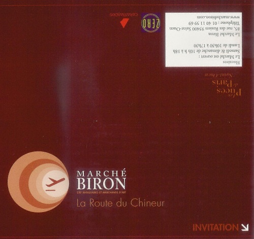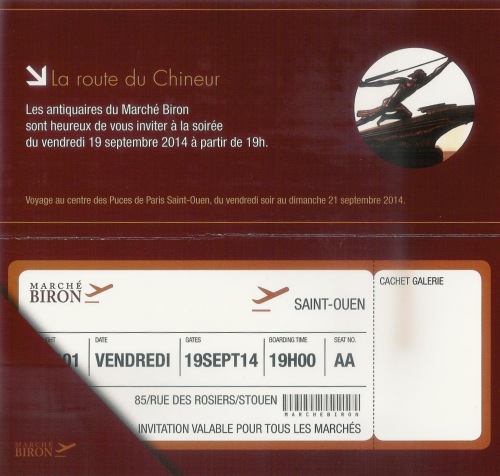 Pour cette rentrée 2014 pendant la 27° Biennale des Antiquaires qui a lieu au Grand palais à Paris, le Marché Biron organise une Soirée Evènement " La Route du Chineur ", vous pouvez ci-dessous découvrir un aperçu de l'invitation à cette soirée.
