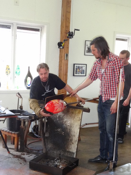 Peter Hermansson et son ami Micke Johansson, maître verrier, réalisant un vase, assisté par un compagnon de poste.