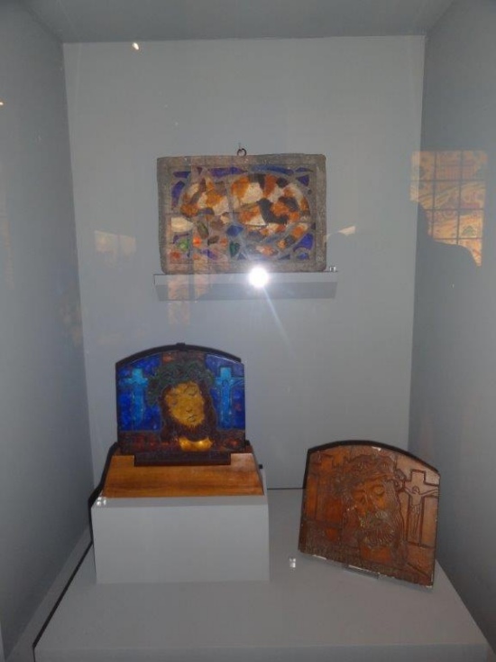 Vitrine avec la plaquette Christ et le vitrail au chat dons de Barlach Heuer.