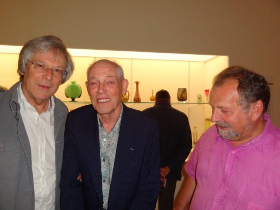De gauche à droite François Leperlier, Barlach Heuer et Christian Gobert devant la nouvelle vitrine des verreries du début du XX° siècle offertes par Barlach Heuer. " Nouvelle Salle Décorchemont " Conches en Ouche 2017.