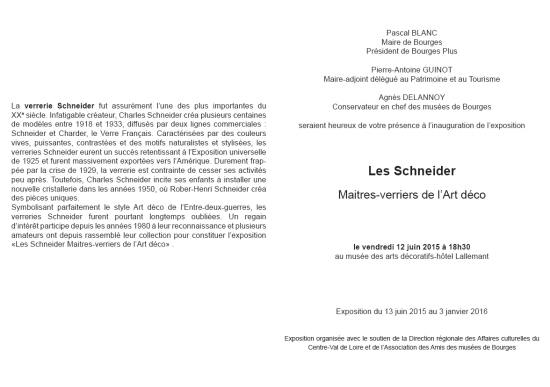 Invitation : " Les Schneider Maîtres Verriers de l'Art Déco " Musée des Arts Décoratifs l'Hôtel Lallemant Bourges (France) : 13 Juin 2015 - 31 Décembre 2015