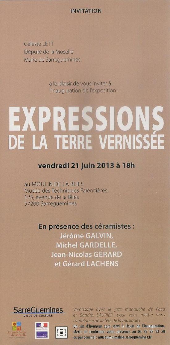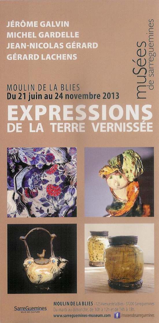 Du 21 Juin au 24 Novembre 2013, le Musée des Techniques Faïencières de Sarreguemines du Moulin de la Blies accueillera l'exposition " Expression de la Terre Vernisée " regroupant les artistes céramistes Jérôme Galvin, Michel Gardelle, Jean-Nicolas Gérard et Gérard Lachens.