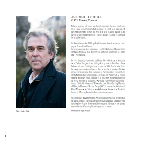 Nous souhaitons ici saluer l’un des Maîtres d’Art de la Ville, verrier à la flamme, Jean-Pierre Baquère, tout récemment décédé. Il a été très présent à la genèse de la Biennale du Verre, généreux en conseils, enthousiaste à chaque nouvelle édition et qui devait participer au comité de sélection de l’appel à création. Il laisse une oeuvre marquée de délicatesse, d’harmonie et de maîtrise. Son investissement à transmettre et à encourager les jeunes l’inscrit à jamais dans la sphère du verre. Notre ville est fière de compter dans la collection de son Musée d’Art et d’Histoire plusieurs de ses créations. "