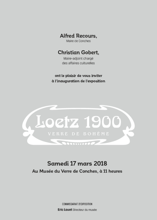 Ci-dessous vous pouvez découvrir le visuel de la plaquette d'invitation au vernissage de l'Exposition " Loetz 1900 Verre de Bohême " qui aura lieu le samedi 17 Mars 2018 en présence de Messieurs, Alfred Recours Maire de Conches, Christian Gobert Maire -Adjoint chargé des affaires culturelles, et d'Eric Louet Directeur des Musées de Conches.