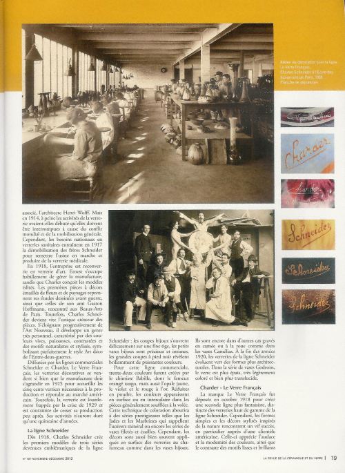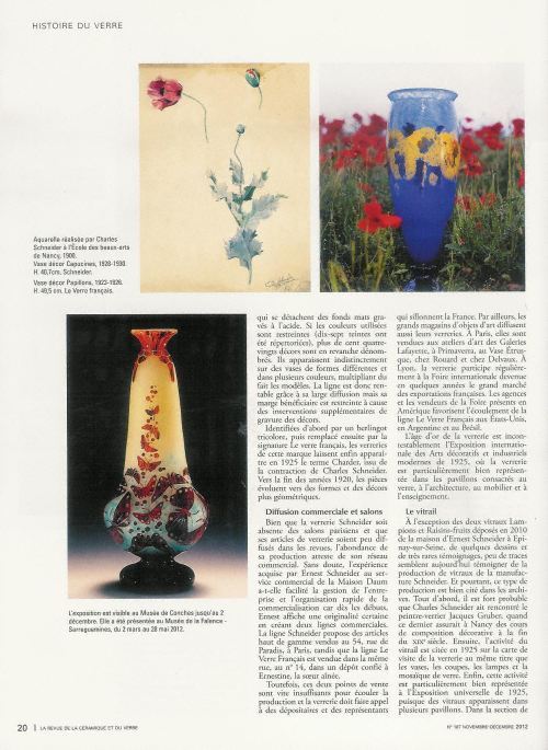 Dans La Revue de la Céramique et du Verre N°187 de novembre-décembre 2012, Monsieur Eric Louet Conservateur consacre sur cinq pages, de la page 18 à la page 21 un article intitulé " Charles Schneider Créateur inspiré de la Verrerie Art Déco " dont voici ci-dessous les visuels. Cette article richement documenté nous présente avec précision l'Artiste Créateur Charles Schneider ainsi que son oeuvre.